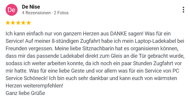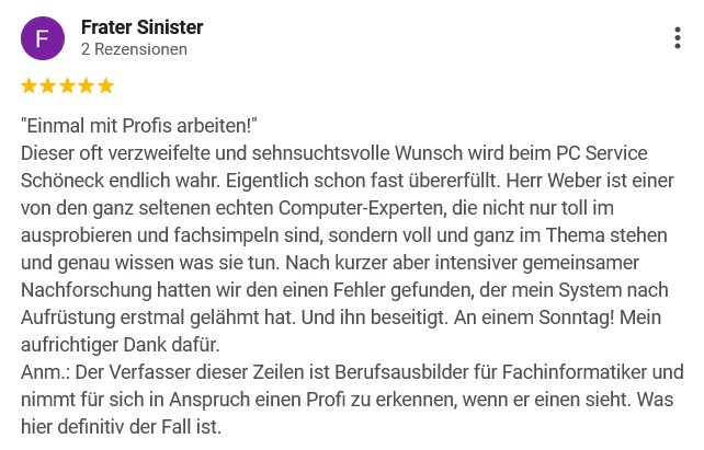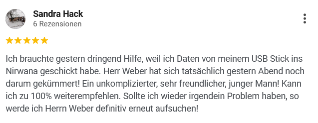 Computer-Probleme kann ich deshalb sehr schnell identifizieren und lösen. Besonders wichtig ist mir dabei, individuell auf Ihre Lage einzugehen, alle Schritte verständlich zu erklären und verlässlich für Sie erreichbar zu sein.